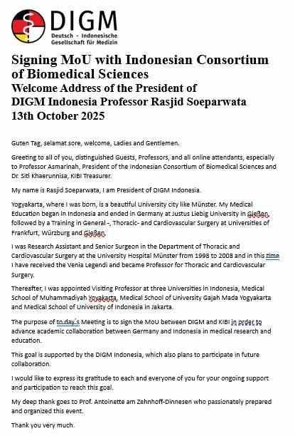 The German-Indonesian Society for Medicine (DIGM) is honored to announce the signing of a Memorandum of Understanding (MoU) with the Indonesian Consortium of Biomedical Sciences (KIBI) on October 13th, 2025, in Münster, Germany.